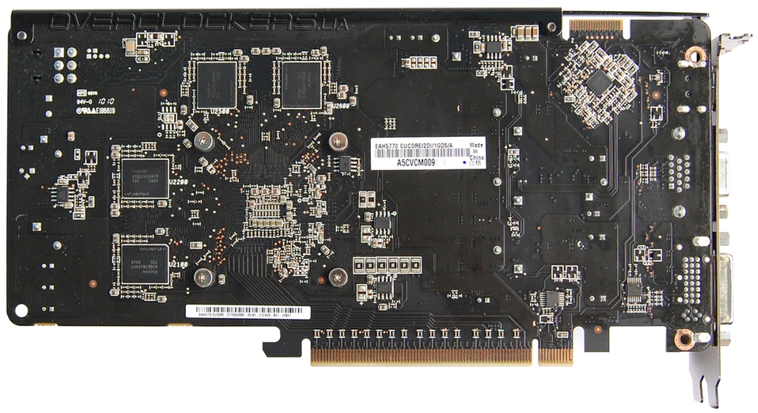 Взглянем на плату без кулера. Дизайн отличается от эталонного — он ближе к дизайну рассмотренной выше модели EAH5770/2DI/512MD5.