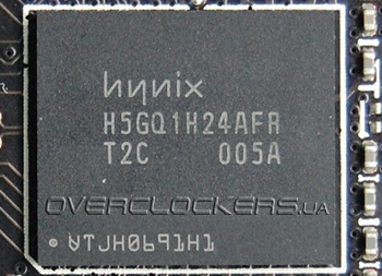 Карта оснащена одним гигабайтом видеопамяти, который набран восемью микросхемами Hynix H5GQ1H24AFR T2C.