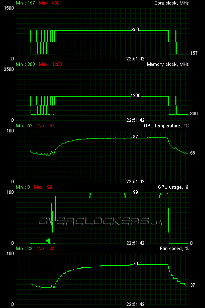 А вот рабочее напряжение с номинальных 1,125 В увеличено до 1,2 В (согласно показаниям утилиты MSI Afterburner). И это довольно сильно сказывается на рабочей температуре ядра. При напряжении 1,2 В температура GPU при 12-минутной нагрузке Crysis Warhead достигала 87 °С. Это выше чем у EAH5770/2DI/512MD5, да и уровень шума заметно больше.