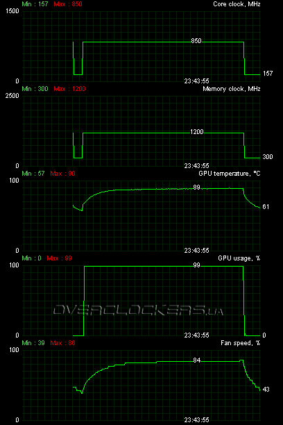 Несмотря на высокое напряжение, с разгоном ядра дела были совсем плохи. Лишь 900 МГц при 1,3 В — вот и все на что способен акселератор ASUS EAH5770 CUCore/2DI/1GD5. Необычайно низкий результат с увеличенным напряжением, при этом видеокарта горячее некуда. В таком режиме даже при максимальных оборотах вентилятора удалось добиться стабильности лишь в игровых тестах. В Fur Rendering Benchmark карта моментально перегревалась. Да и постоянно на 900 МГц видеокарту тоже не поэксплуатируешь — сказывается перегрев. Для длительных тестов нам пришлось установить вентилятор на обдув платы.