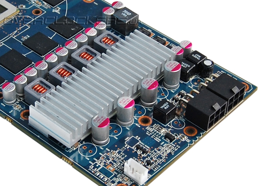 Взглянем на саму плату. Бросается в глаза некоторая «бюджетность» продукта на фоне старших решений серии HD 5800 — использование дешевых дросселей и простых полевых транзисторов.