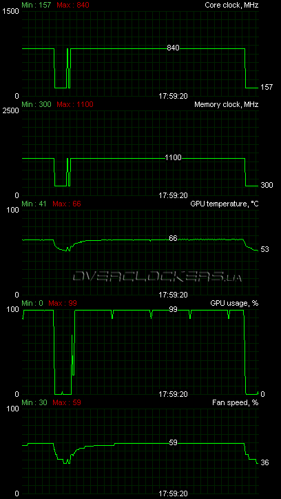 Температуры в игровом режиме довольно скромные. При нагрузке демо-записью Ambush из Crysis Warhead Benchmarking Tool на максимальных настройках качества при разрешении 1920x1200 со сглаживанием нагрев ядра не превысил 66 °С ( при 27 °С в помещении).