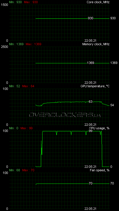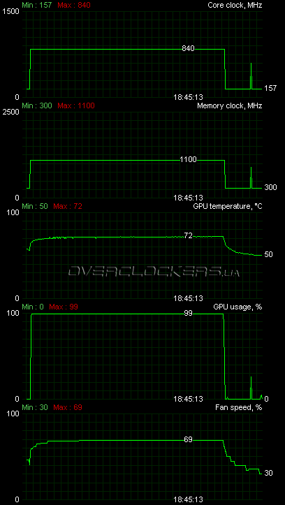В FurMark («тест стабильности» при 1680x1050 с включенными пост-эффектами) максимальная температура составила 72 °С.