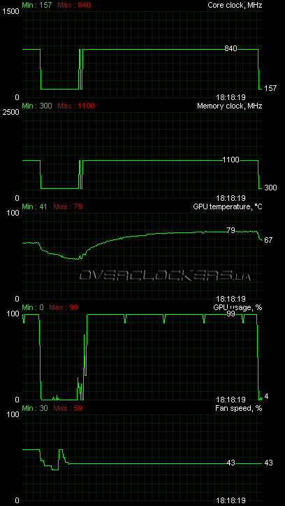 Для эффективной теплоотдачи массивного радиатора требуется хороший обдув. В данном случае из-за небольшого диаметра вентилятора при большой длине всей конструкции требуются большие обороты для создания более мощного воздушного потока. Вот и получается, что потенциал кулера неплохой, но максимум эффективности будет достигаться при большом уровне шума. Но, судя по невысоким температурам, с охлаждением карты кулер может справиться и в более тихом режиме. Мы решили это проверить и зафиксировали обороты на 40% (2000 об/мин). В таком режиме при нагрузке Crysis Warhead ядро прогрелось до 79 °С.