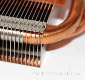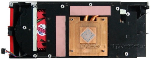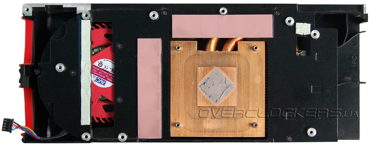 Радиатор GPU не отличается большими размерами. Его эффективность обеспечивается двумя толстыми тепловыми трубками и высокими оборотами радиального вентилятора.