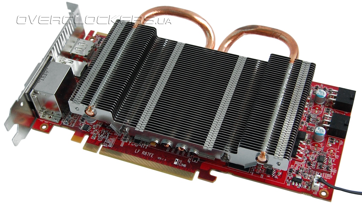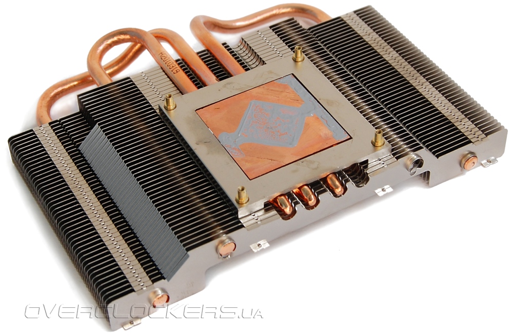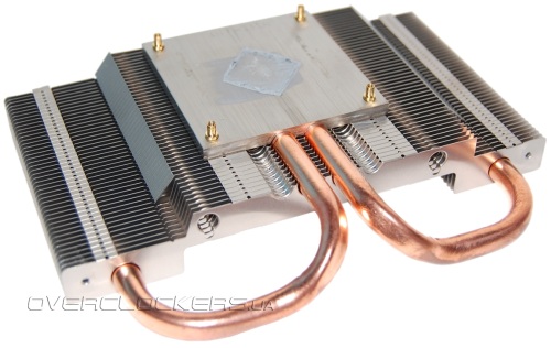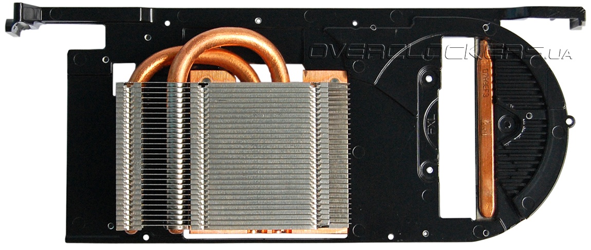 Радиатор GPU не отличается большими размерами. Его эффективность обеспечивается двумя толстыми тепловыми трубками и высокими оборотами радиального вентилятора.