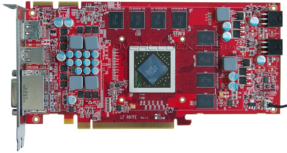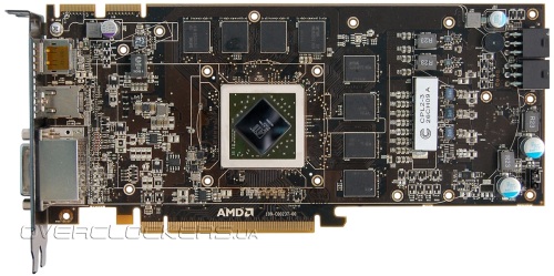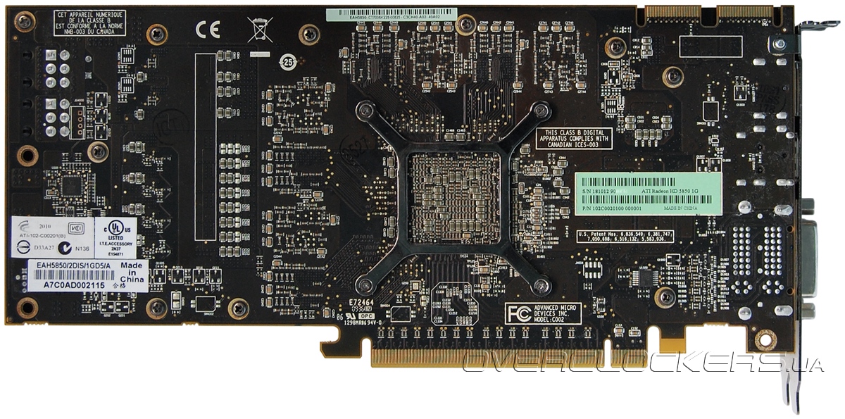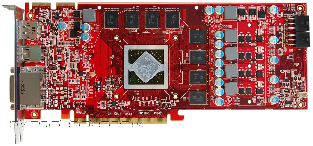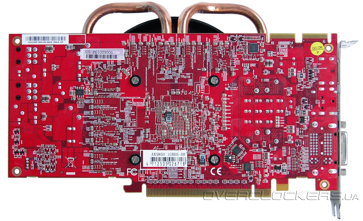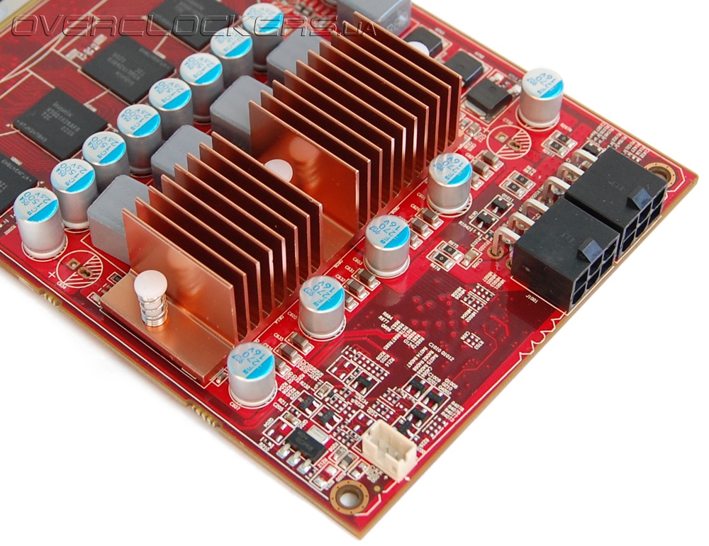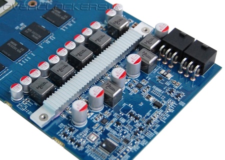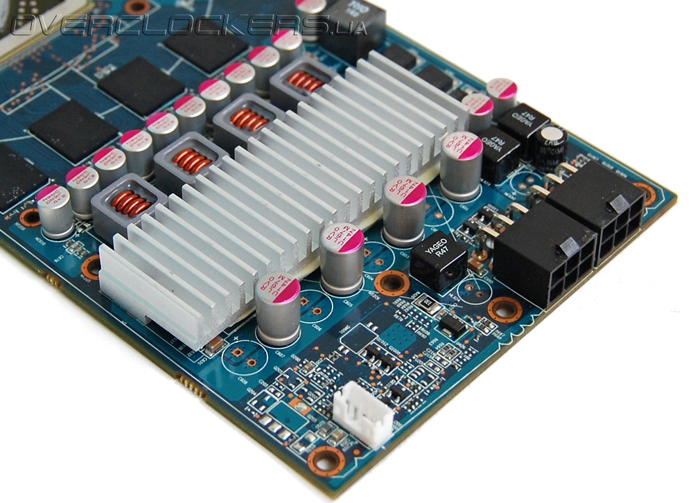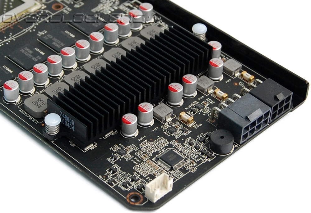 Взглянем на плату. Справа мы видим пятифазную систему питания (четыре — на ядро, одна — на питание памяти GDDR5). Кстати, если на более простом Radeon HD 5850 использовалась парочка танталовых конденсаторов, то PCS+ обходится без таких дорогих компонентов.
