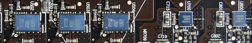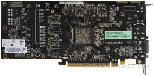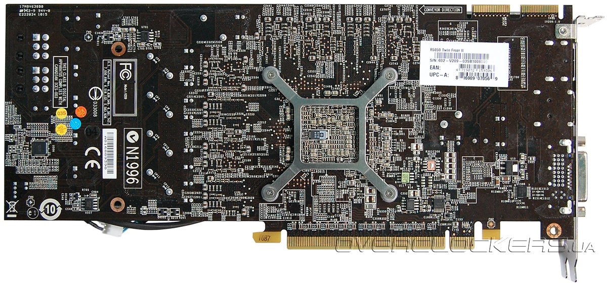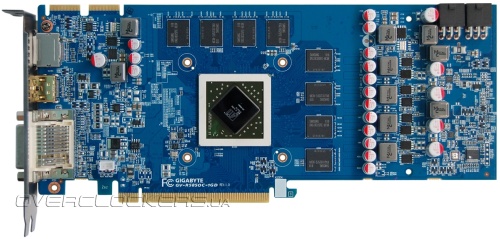 Четырехфазная система питания ядра реализована на полевых транзисторах со сверхнизким сопротивлением в открытом состоянии под управлением контроллера uP6213. Кстати, часть транзисторов вынесена на заднюю сторону платы и для них никакого охлаждения не предусмотрено. На лицевой стороне находится микроконтроллер PIC16F690. Такой же мы видели на видеокарте Gigabyte GV-R577SO-1GD. Предположительно, он отвечает за аппаратную реализацию функций мониторинга и управления питанием при использовании программной оболочки Gigabyte OC Guru. Вот только никакой информации о возможности софтвольтмода и поддержке утилитой OC Guru видеокарты GV-R585OC-1GD нет.