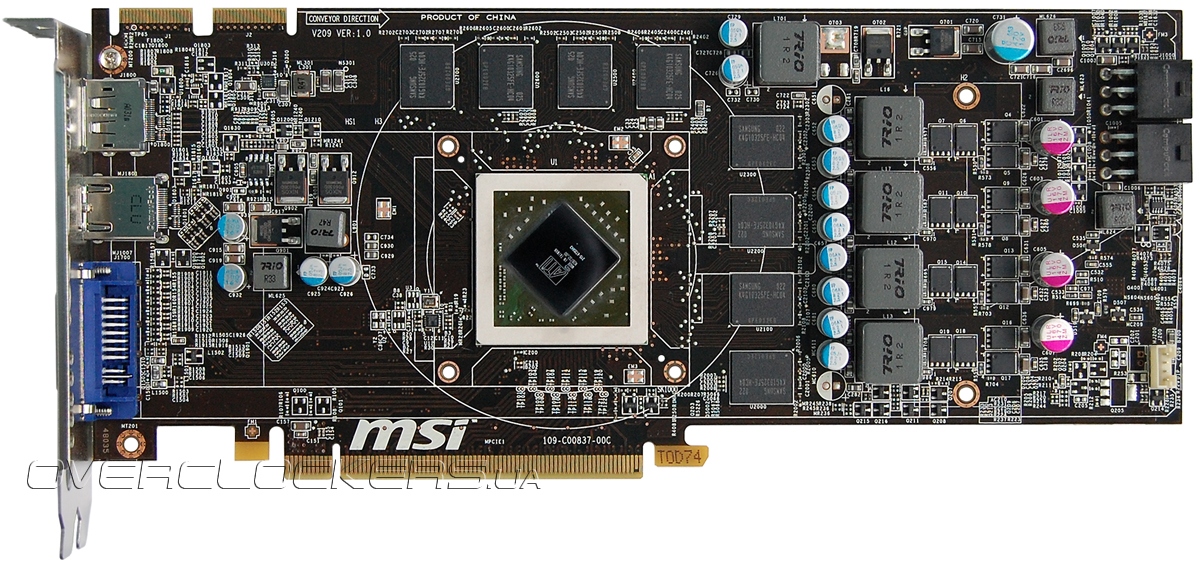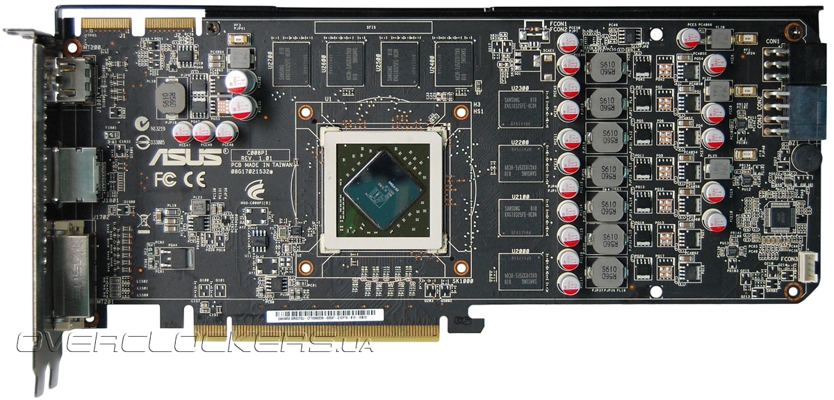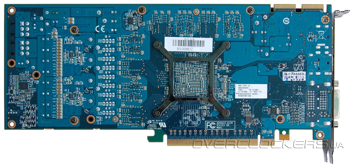 Один гигабайт видеопамяти набран восемью микросхемами Samsung K4G10325FE-HC04.