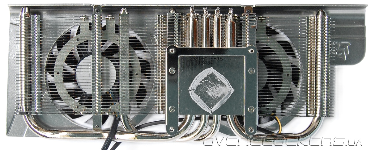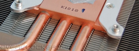 Пластины радиатора имеют желобки и отверстия еще под две трубки, которых нет. Это объясняется использованием кулера единой конструкции в разных моделях HD 5850 от Tul Corporation.