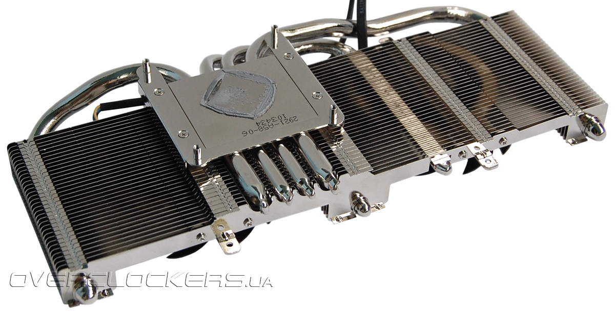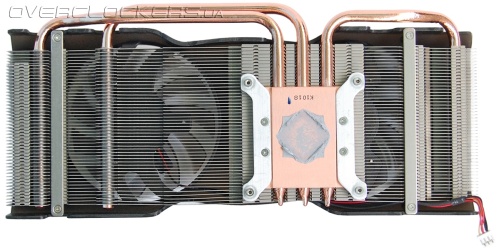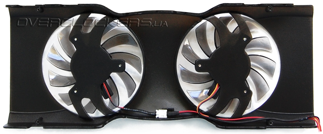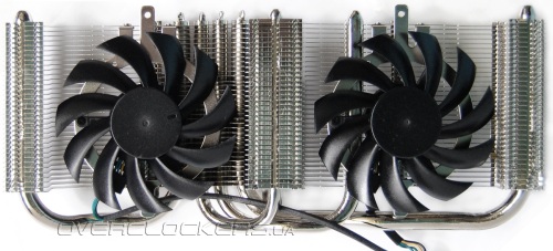 Двухслотовый кулер полностью накрывает видеокарту и вентиляторы обеспечивают обдув всех компонентов на плате. Вентиляторы расположены под небольшим углом относительно поверхности карты.