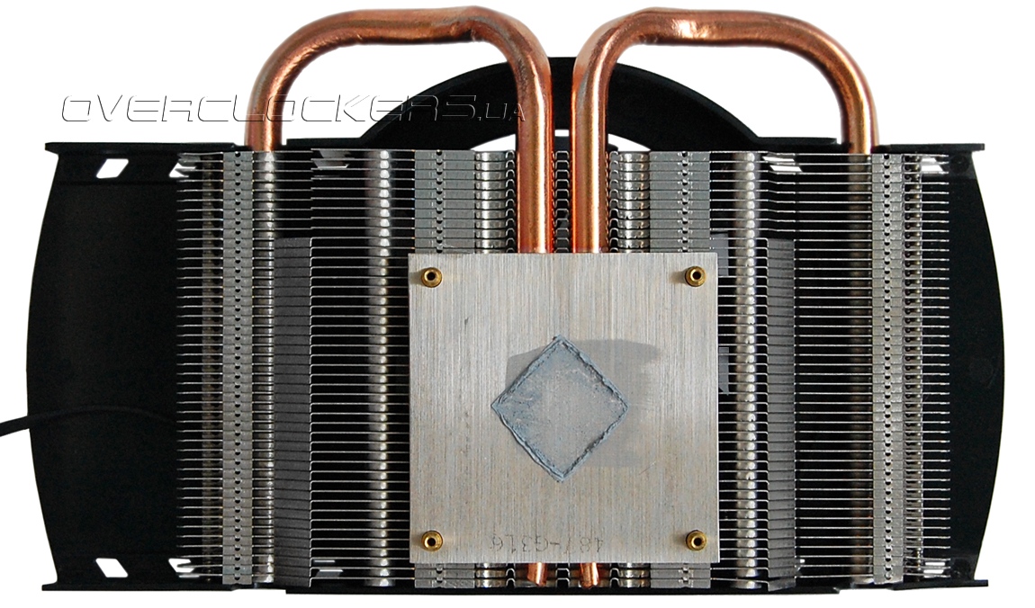 Под кожухом кулера скрывается приличный радиатор с двумя 8-мм тепловыми трубками, который обдувается вентилятором 92 мм (диаметр лопастей 88 мм).