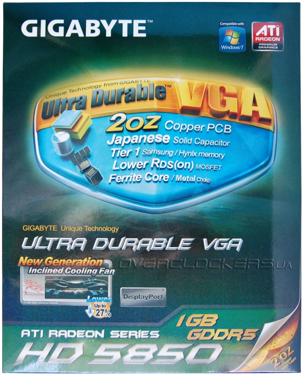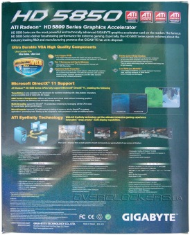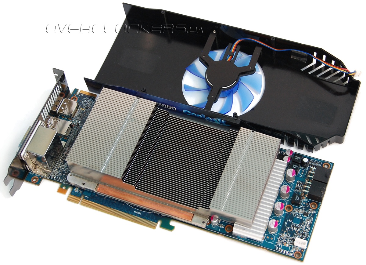 Адаптер выполнен в черных тонах. Сбоку прикручена металлическая планка, играющая роль ребра жесткости. На ней выгравирован логотип компании. Кулер на фоне обычной турбины кажется вроде бы небольшим, но это эффект большого кожуха у референса. Массивные тепловые трубки, выглядывающие сбоку, внушают уважение. Бросается в глаза и наличие одного восьмиконтактного разъема питания, в то время, как все Radeon HD 5850 довольствуются двумя 6-контактными.
