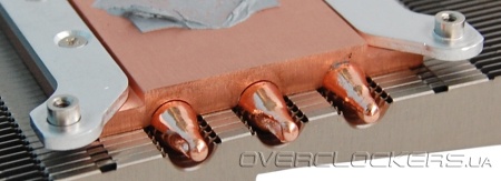 Трубки уложены в тщательно подогнанные под их форму желобки медного основания. Такие же желобки имеют и пластины, контактирующие с трубками у основания кулера. Надежный контакт обеспечивается пайкой.