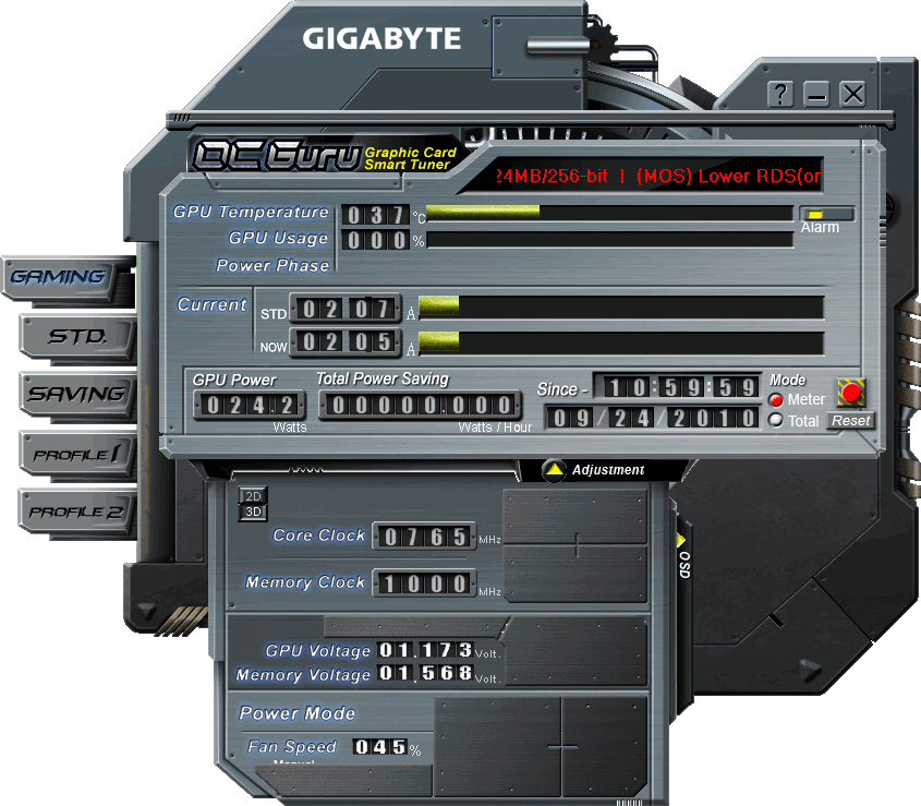 Утилита позволяет переключать видеокарту в один из стандартных профилей — в Gaming карта функционирует на 765/4000 МГц при напряжении 1,17 В, в Saving на 725/4000 при стандартном 1,087 В на ядре. Кстати, вот и секрет разгона GPU до 940 МГц, ведь изначально напряжение выше стандартного на 8%. Хотя даже для 1,17 В частота в 940 МГц довольно высокая.