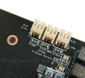 Как и прочие оверклокерские продукты MSI, данный акселератор имеет три разъема для измерения рабочих напряжений (GPU/MEM/PLL). В них вставляются специальные переходники под щупы мультиметра.