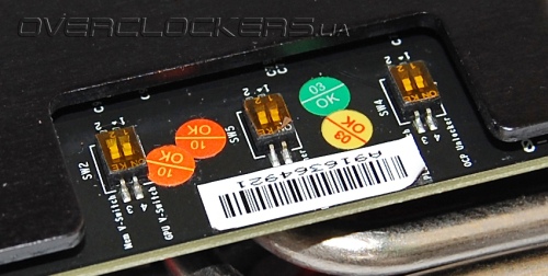 Возможно вы уже обратили внимание на ряд переключателей, расположенных на обратной стороне платы. Сбоку, недалеко от точек замера напряжения, находятся джамперы V-Switch (снимает ограничение по максимальному напряжению), OCP Unlock (снимает ограничение по току в 320 А?!), PWM Clock Tuner (переключение PWM с 266 на 350 МГц для устранения пульсаций). Конечно, если вы не собираетесь баловаться жидким азотом для установления рекордов, то лучше данные переключали не трогать.