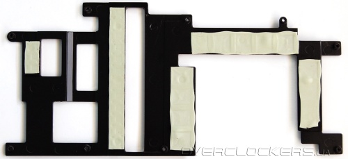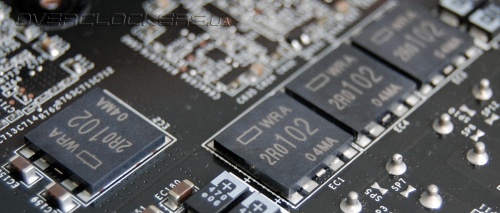 С лицевой стороны плата, как и положено, закрыта радиатором, контактирующим с микросхемами памяти и всеми силовыми элементами системы питания. Последние, кстати, нуждаются в мощном охлаждении при разгоне. В данном случае, честно говоря, мы ожидали увидеть более массивный радиатор, ведь данный продукт ориентиров именно на разгон.