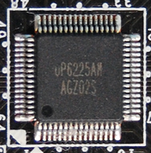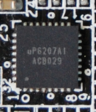 Половину площади занимает огромная система питания, которая насчитывает 12 фаз для GPU, три фазы для памяти GDDR5 и одну для PLL. Первая реализована на ШИМ-контроллере uP6225AM от uPI Semiconductor, который отвечает за шесть каналов, каждый по две фазы под управлением контроллера uP6282AD. За питание памяти отвечает контроллер uP6207AI.