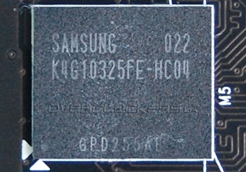 Общий объем памяти в 1536 мегабайт набран 12 микросхемами Samsung K4G10325FE-HC04, которые рассчитаны на частоту 5 ГГц.