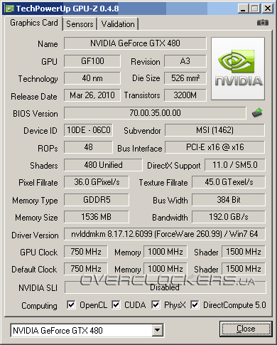 Ну а как же обстоят дела с разгоном? Сразу оговоримся, что все наши эксперименты в этом направлении проводились лишь с родным кулером без экстрима. Памятуя об удачном Zotac GeForce GTX 480 AMP!, который прошел все игровые тесты на частоте ядра 870 МГц, мы рассчитывали на круглую цифру 900 МГц, но не сложилось. Даже на 890 МГц N480GTX Lightning работал крайне нестабильно, независимо от подаваемого напряжения. В итоге мы остановились на 880 МГц при повышенном на 43 мВ напряжении (для данной карты в MSI Afterburner устанавливается дельта от номинала, а не конкретное итоговое значение). Кстати, при более низкой частоте и таком же напряжении карта была нестабильна, да и более высокие напряжения при 880 МГц тоже приводили к снижению стабильности, а вот комбинация из 880 МГц и +43 мВ оказалась максимально удачной. Разгон памяти (как для GeForce GTX 480) внушительный — 4400 МГц. Максимум, который нам удавалось получить на картах этой серии, — 4200 МГц на уже упоминавшемся Zotac AMP!
