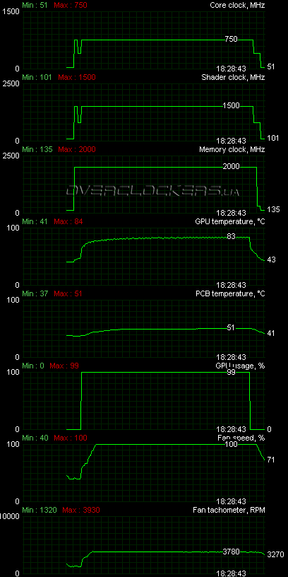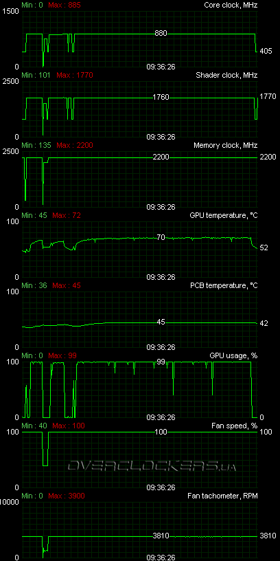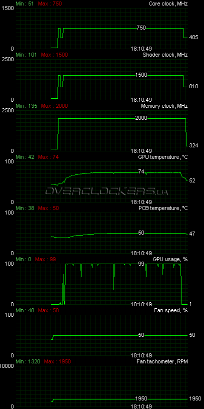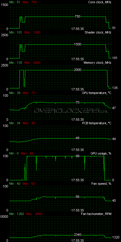 Эффективность системы охлаждения на высоте. При 12-минутной игровой нагрузке Crysis Warhead (демо-запись Ambush в Crysis Warhead Benchmarking Tool) на максимальных настройках качества со сглаживанием при разрешении 1920x1200 ядро не прогрелось выше 73 °C. Причем, как видно по нижнему графику, это пиковое значение наблюдается в самом начале теста, что связано с постепенным поднятием оборотов вентиляторов вслед за ростом температуры. После достижения необходимого уровня оборотов температура нормализуется и стабильно держится в пределах 70 градусов (при 24 °C в помещении). Результат просто великолепный, если вспомнить, что у референса температура в играх легко переваливает за 90 °C.