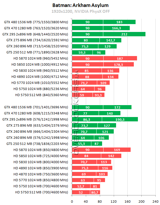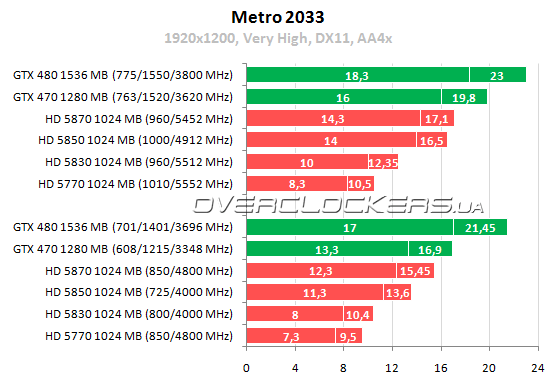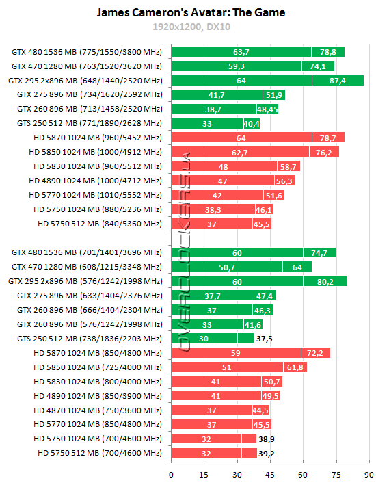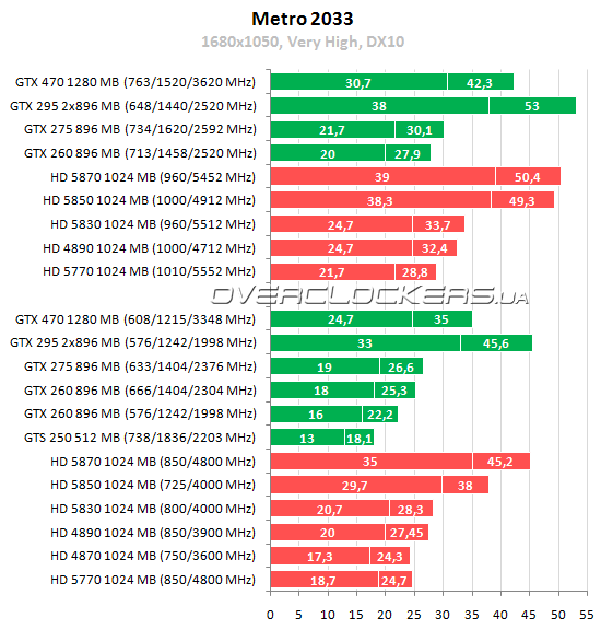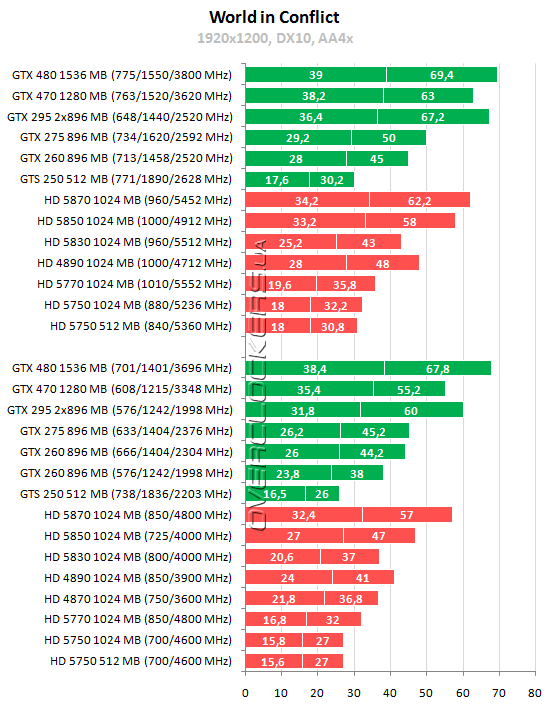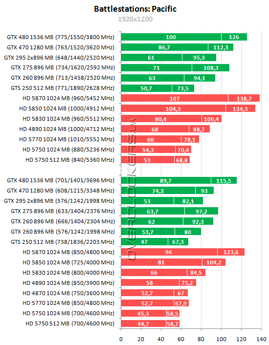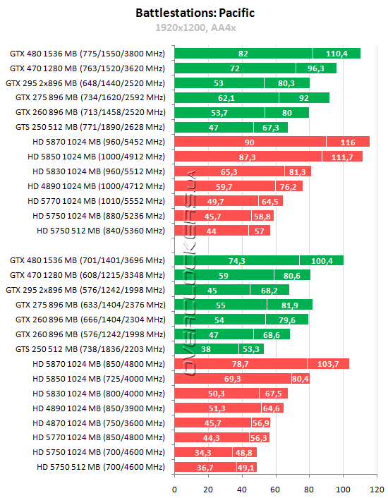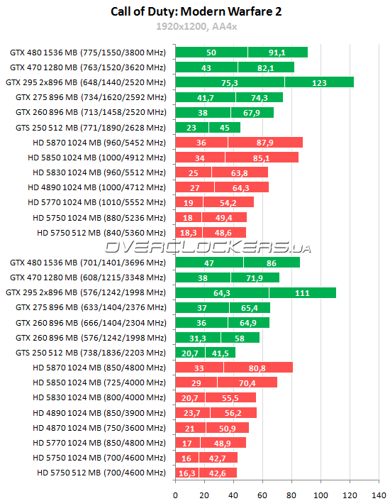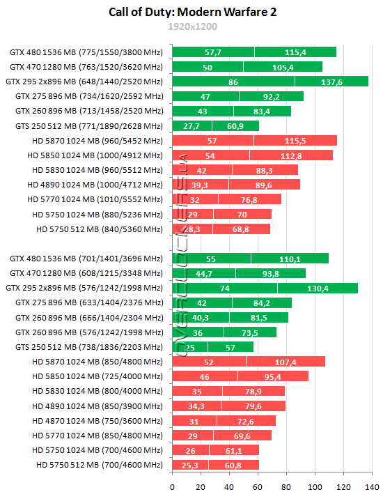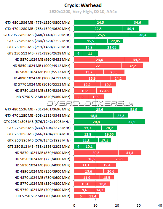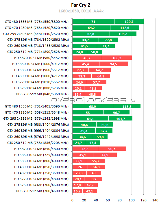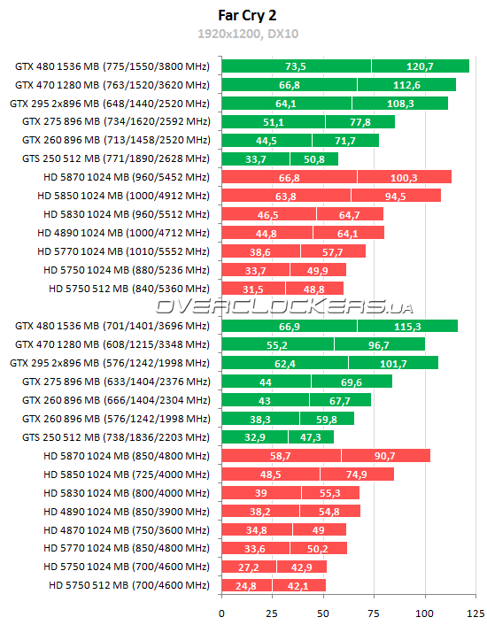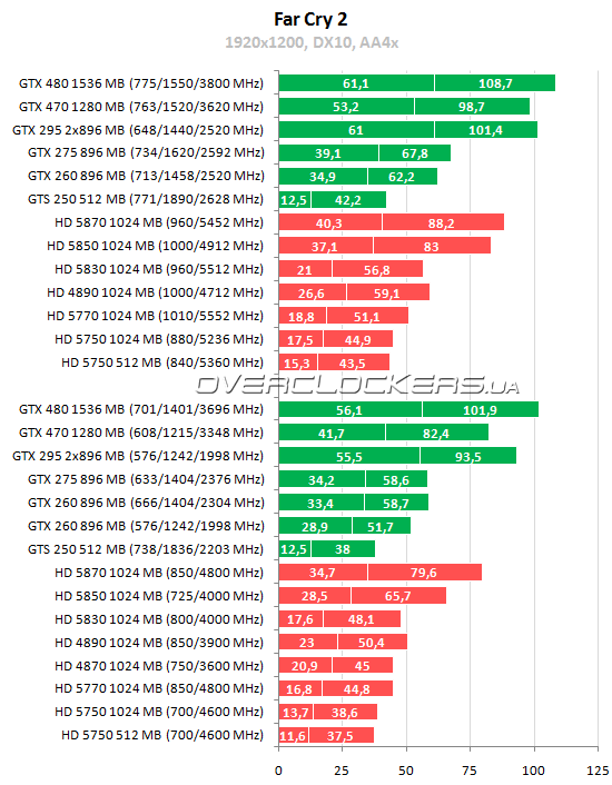 GeForce GTX 480 снова уверенно занимает лидерские позиции. По среднему fps от него едва отстает GeForce GTX 295, но по минимальному показателю уступает Radeon HD 5870. GeForce GTX 470 обгоняет Radeon HD 5870, но разница между ними мизерная и в одном режиме (1920х1200 без АА) лучшие результаты даже оказываются у карты AMD.