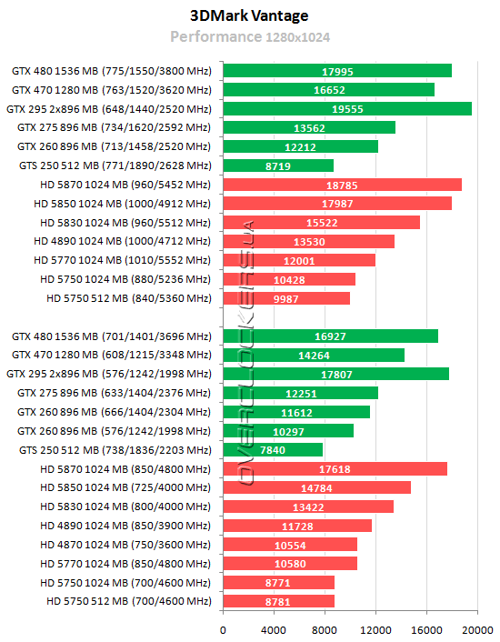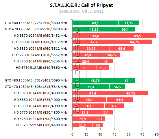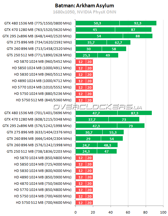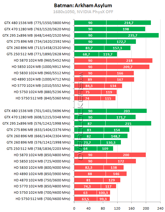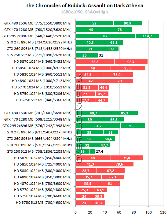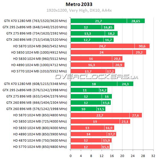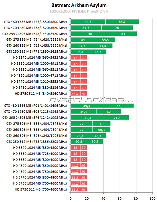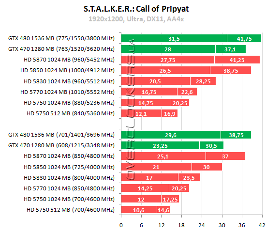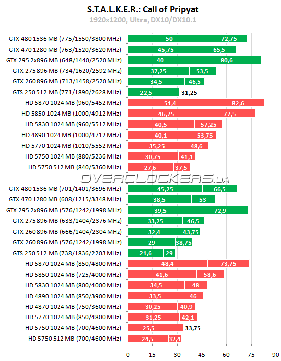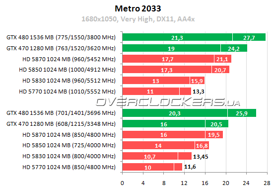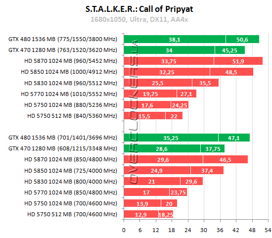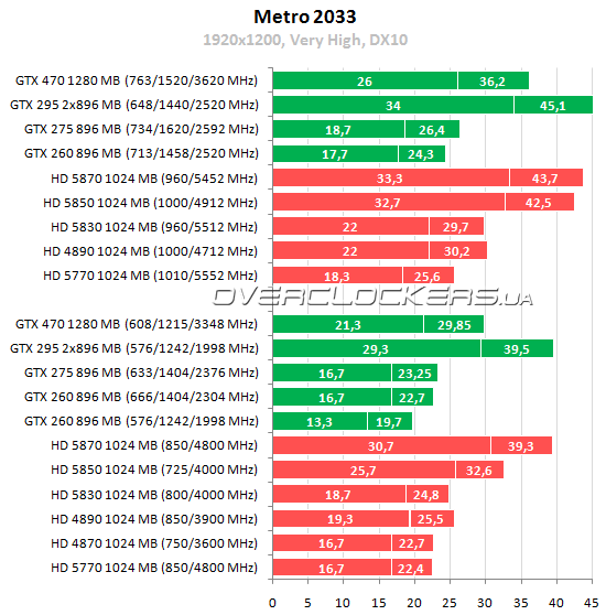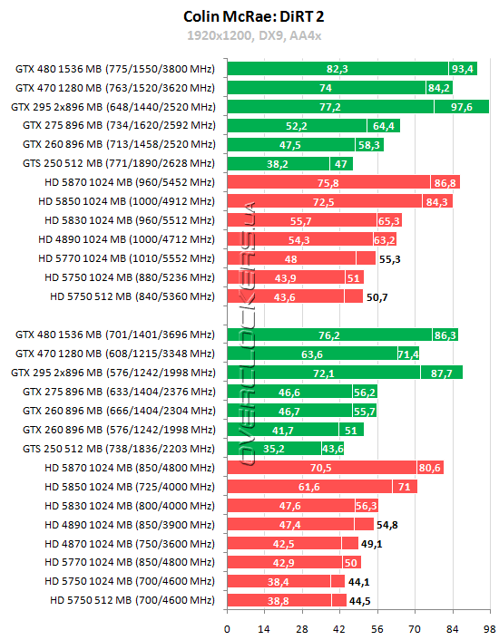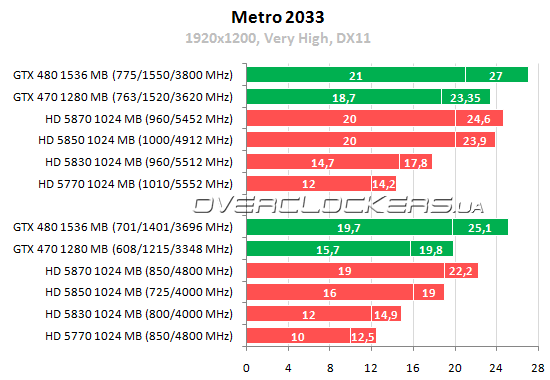 GeForce GTX 480 снова уверенно занимает лидерские позиции. По среднему fps от него едва отстает GeForce GTX 295, но по минимальному показателю уступает Radeon HD 5870. GeForce GTX 470 обгоняет Radeon HD 5870, но разница между ними мизерная и в одном режиме (1920х1200 без АА) лучшие результаты даже оказываются у карты AMD.