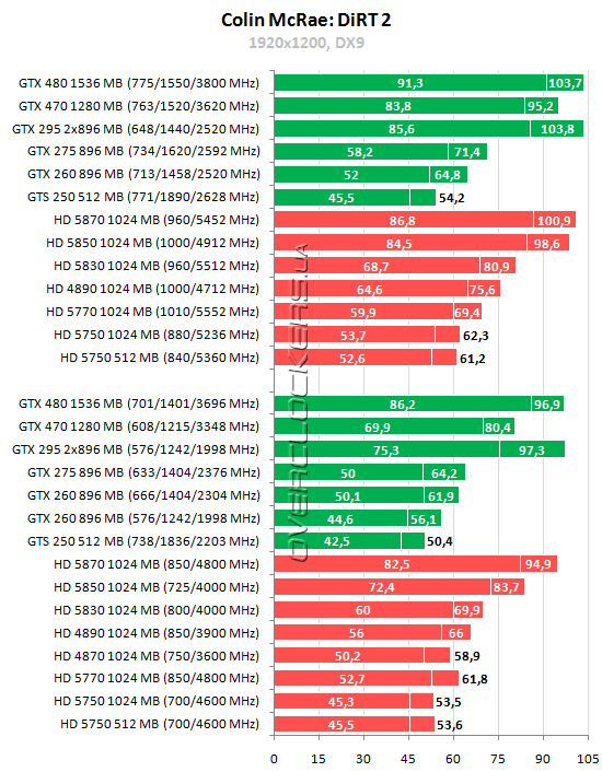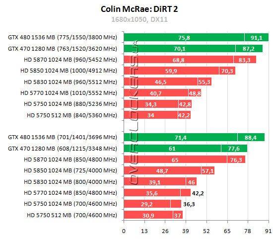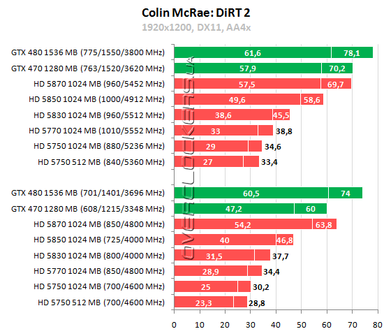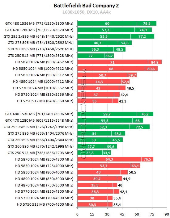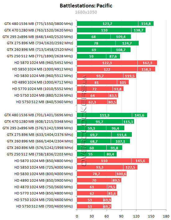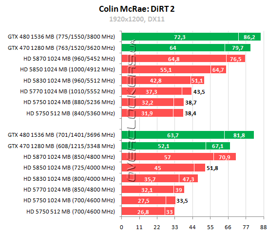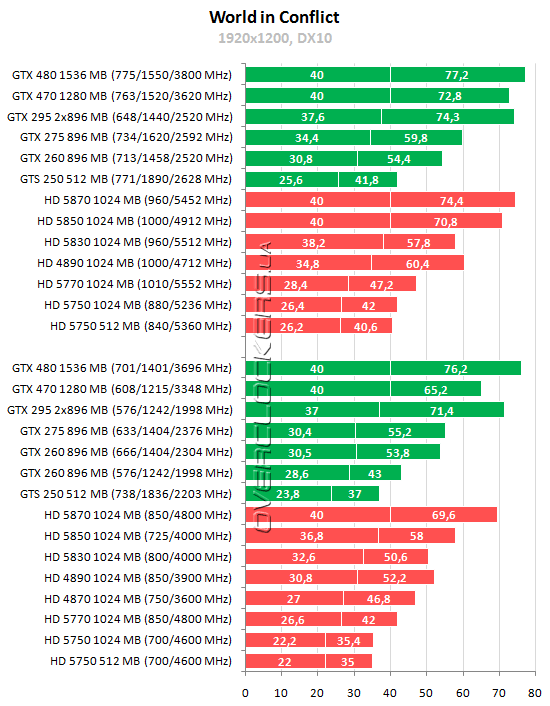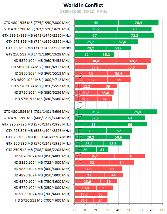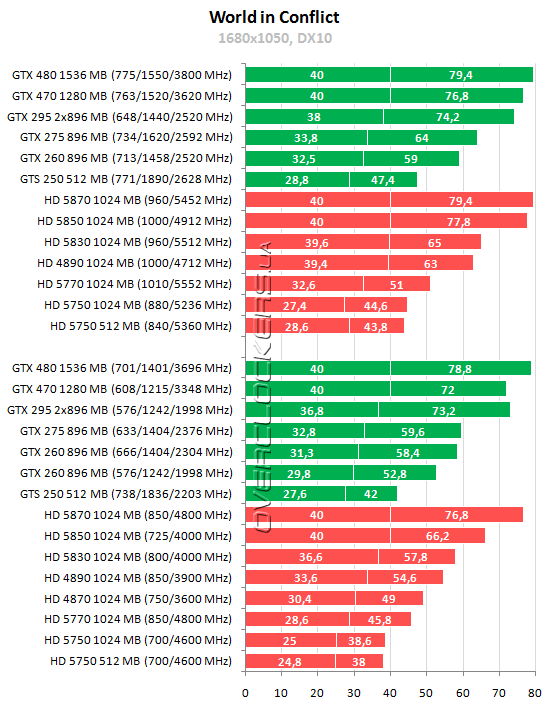 Вновь отлично проявляет себя GeForce GTX 295. Одночиповым GeForce GTX 480 и Radeon HD 5870 удается обойти «старичка» лишь по минимальному fps. В противостоянии между ними самими минимальное преимущество у GeForce GTX 480. А вот младший Fermi уступает Radeon HD 5850. С разгоном расстановка сил не меняется.