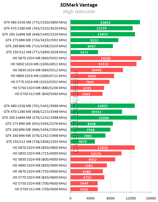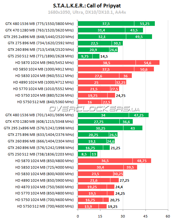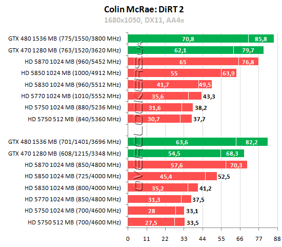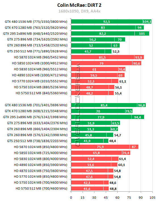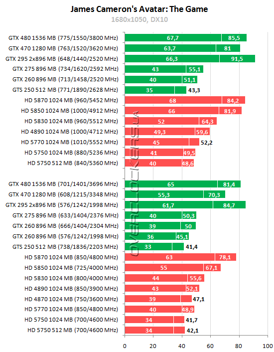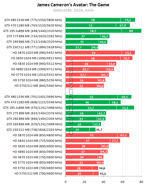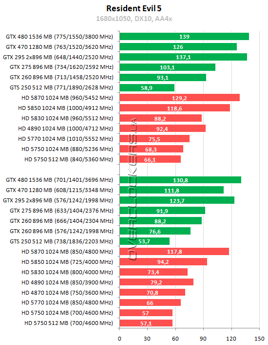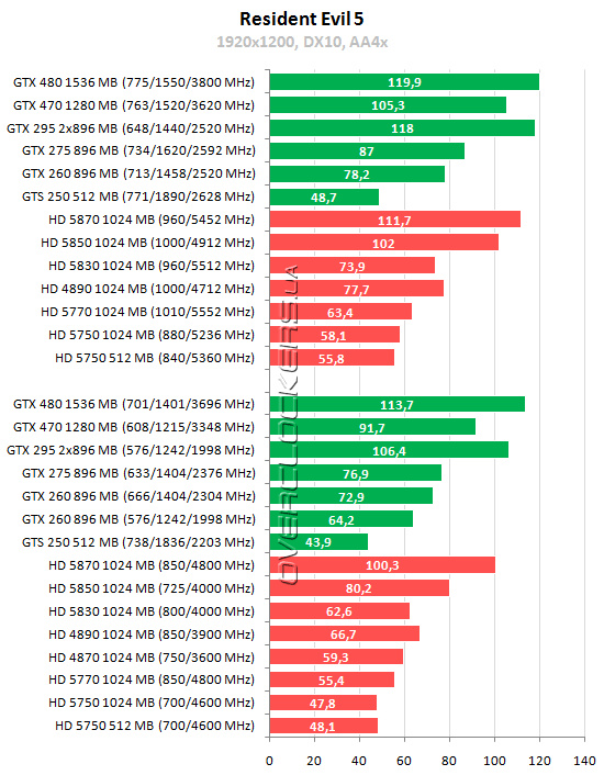 Лидером является GeForce GTX 480. GeForce GTX 470 идет наравне с GeForce GTX 295 в простых режимах, но при активации сглаживания двухчиповая карта демонстрирует более высокие результаты. С разгоном представители Fermi оставляют «старичка» позади во всех режимах тестирования. Radeon HD 5870 оказывается слабее GeForce GTX 480 в простых режимах, а со сглаживанием даже уступает GeForce GTX 470. Radeon HD 5850 в такой ситуации приходится еще сложнее, фактически эта карта идет наравне с GeForce GTX 275. Хороший разгон помогает старшим Cypress значительно прибавить в производительности и достигнуть показателей старших GeForce в простых режимах. Но при сглаживании уровень производительности GeForce GTX 480 на номинальных 701/1401/3696 МГц является недостижимым для Radeon HD 5870 даже при разгоне до 960/5452 МГц.