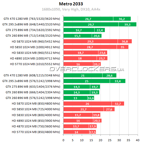 Даже в не самом высоком по нынешним меркам разрешении 1680x1050 мы видим, что лишь Radeon HD 5850, GeForce GTX 470 и более дорогие модели в состоянии обеспечить комфортный уровень производительности. Справедливости ради отметим, что наш тест проводится на открытой локации, в помещениях и туннелях у всех видеокарт производительность выше. Да и из-за «плавности» самой игры существенного дискомфорта не чувствуется даже на Radeon HD 5830 или GeForce GTX 275, просадки до 20 кадров реально не ощущаются. Так что нетребовательные игроки вполне могут обойтись и видеокартами такого уровня для игры в «Метро 2033».