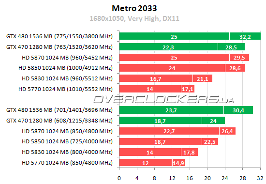 В DirectX 11 GeForce GTX 470 уже не только обходит Radeon HD 5850, но даже и Radeon HD 5870 в тяжелых режимах. Преимущество GeForce GTX 480 над старшей моделью AMD варьируется от 13% в простых режимах до 38% при активном сглаживании. В реальности, конечно, такое поразительное превосходство в тяжелом режиме не имеет практической пользы, ведь даже GeForce GTX 480 может обеспечить комфортный уровень производительности при рендеринге в DirectX 11 только в разрешении 1680x1050. И это единственная одночиповая карта, которую вообще можно было бы порекомендовать для игры «Метро 2033».