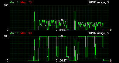 GeForce GTX 480 является безоговорочным лидером, стабильно обходя на 24-25% GeForce GTX 470 и на 10-23% Radeon HD 5870. Максимальное преимущество над конкурентом AMD по минимальному fps. GeForce GTX 470 на фоне Radeon HD 5850 демонстрирует не столь веское преимущество – до 10 процентов по минимальному показателю и не более 2,5% по среднему показателю. GeForce GTX 295 демонстрирует очень низкие результат, едва превосходя простой GeForce GTX 260. Похоже, это еще одно приложение, безразличное к SLI и многочиповым конфигурациям. Хотя если взглянуть на график загрузки GPU в игре, то мы увидим, что второе ядро не простаивает и все же немного загружено, но производительность от этого не выше чем у одночиповых аналогов.