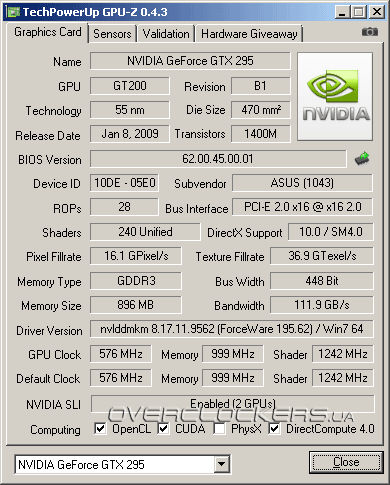 На тестирование к нам попала видеокарта ASUS ENGTX295/2DI/1792MD3/A, которая относится еще к первой ревизии, т.е. физически каждый GPU имеет свою плату. В более поздней версии все элементы расположены на одной печатной плате. В отдельной статье мы сравнивали обе эти версии, и рассмотрели каждую в деталях. Так что подробно останавливаться на данном продукте смысла нет, но поскольку именно эта модель в исполнении ASUS фигурирует у нас впервые, некоторые комментарии мы приведем.
