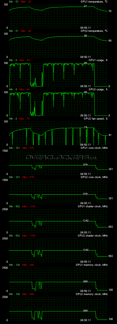 Карта довольно горячая и громкая. При температуре в помещении около 28 градусов Цельсия под хорошей нагрузкой (пятикратный прогон демо-записи Ambush из Crysis Warhead Benchmarking Tool в разрешении 1920х1200 на максимальных настройках со сглаживанием AA4x) ядра прогревались до 90 °С при довольно высоких оборотах вентилятора системы охлаждения.