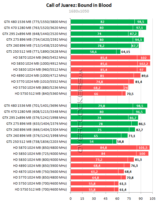 В данной игре Radeon HD 5870 уступает во всех режимах GeForce GTX 480, а при активном сглаживании еще и GeForce GTX 295. Radeon HD 5850 уступает своему главному конкуренту в лице GeForce GTX 470 от 14 до 18 процентов.