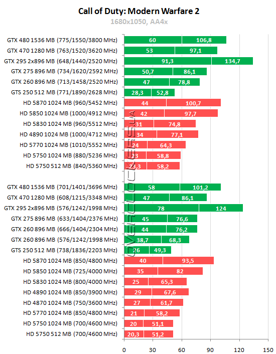 В этом популярном сетевом шутере старшие видеокарты Radeon возвращают себе пальму первенства в 1680x1050. В простом режиме GeForce GTX 480 является конкурентом не Radeon HD 5870, а Radeon HD 5850. Но уже при активации сглаживания ситуация немного меняется, но все равно Radeon HD 5870 остается лидером.