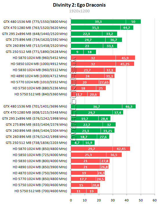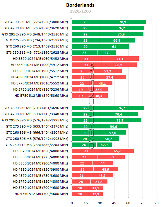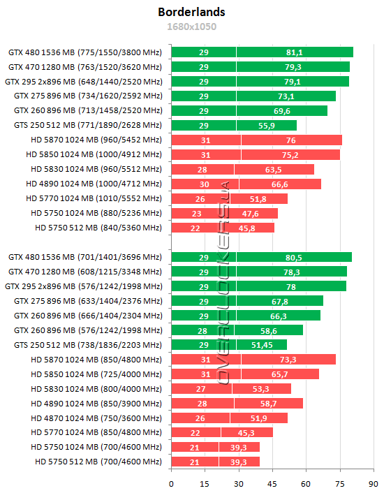 Еще одна игра, демонстрирующая тотальное превосходство решений NVIDIA. Даже GeForce GTX 275 отлично конкурирует с Radeon HD 5870. Старший Radeon HD 5870 хоть и оказывается быстрее, но уступает обоим Fermi и двухчиповому GeForce GTX 295. Последний, кстати, демонстрирует результаты идентичные GeForce GTX 470. Еще один провал для Radeon HD 5830, который уступает до 11% Radeon HD 4890, по среднему fps оказываясь немногим лучше GeForce GTS 250. Производительность Radeon HD 5770 еще ниже, в самом конце рейтинга плетутся Radeon HD 5750. Заметно крошечное преимущество (1%) карты с большим объемом памяти в разрешении 1920х1200.