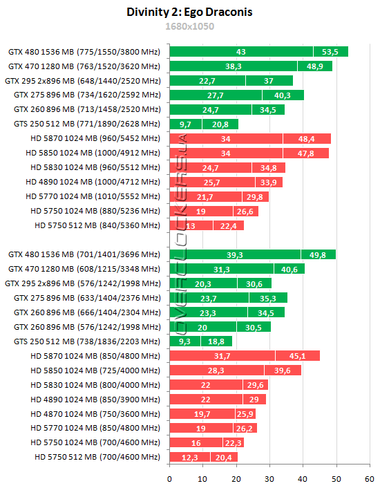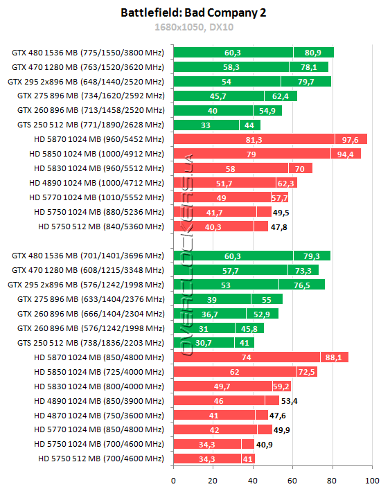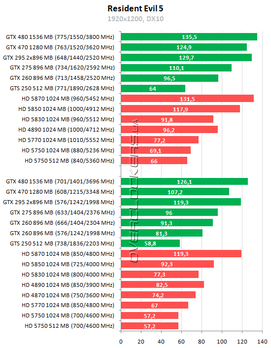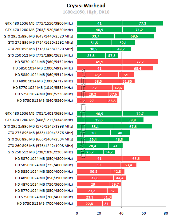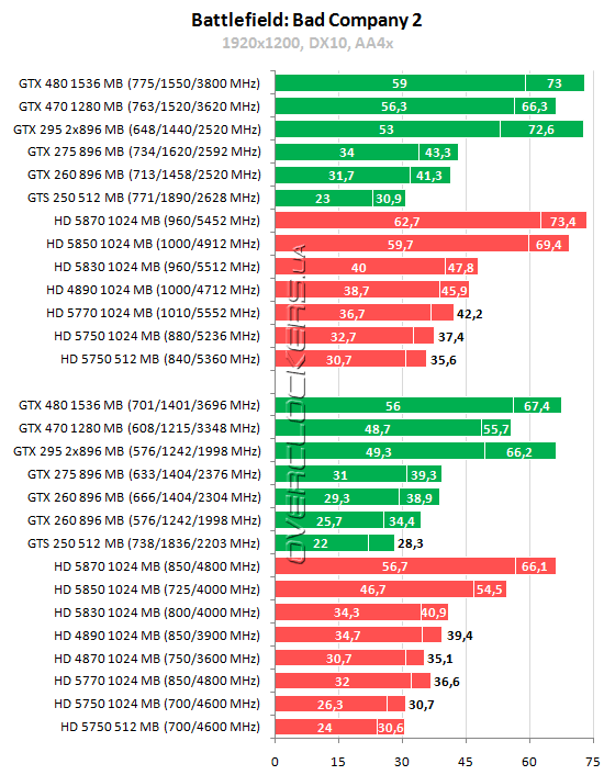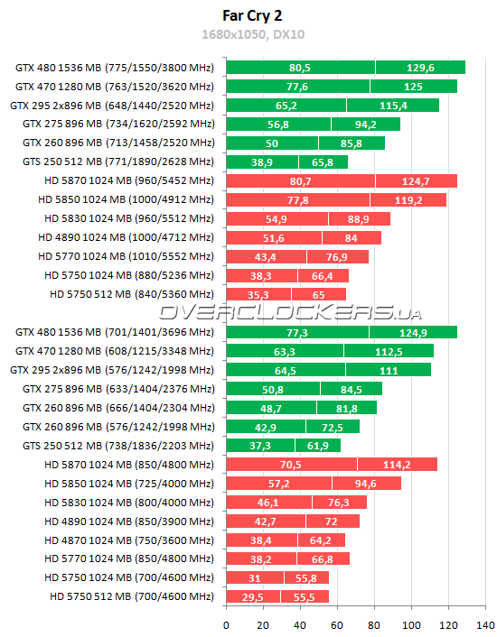 GeForce GTX 480 является лидером как в номинальных режимах, так и при разгоне. Даже высокий разгонный потенциал не помогает Radeon HD 5870 оттеснить соперника с «пьедестала». В противостоянии Radeon HD 5850 и GeForce GTX 470 лучшим оказывается тоже карта NVIDIA. Очень хорошие результаты средней частоты кадров демонстрирует GeForce GTX 295, но по минимальному fps он слабо отличается от одночиповых собратьев прошлого поколения. Radeon HD 5830 в который раз немного не дотягивает до уровня предшественника Radeon HD 4890, а Radeon HD 5770 снова уступает Radeon HD 4870. Старичок GeForce GTS 250 оказывается предпочтительнее Radeon HD 5750. Примечательно, что даже не на самых высоких настройках качества видеокарта Radeon HD 5750 с большим объемом памяти оказывается чуть производительнее модели ASUS с 512 МБ. При повышении настроек качества и разрешения это преимущество только увеличивается.