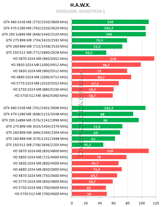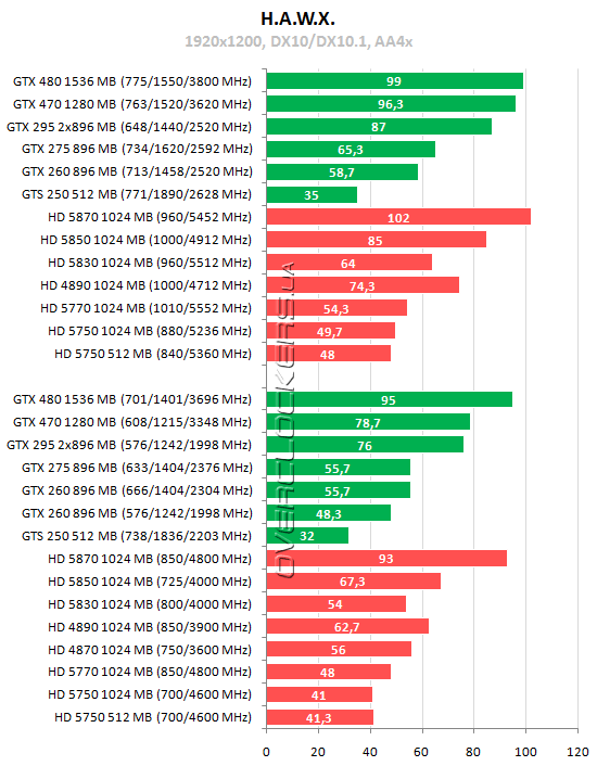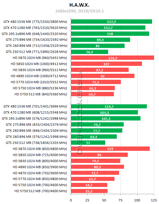 Считается, что игра H.A.W.X. более благосклонна в видеоадаптерам AMD, и действительно Radeon HD 5870 обходит по производительности GeForce GTX 480, хотя разница между ними минимальна – от 1 до 4 %. А в максимальном разрешении с мультисемплингом конкурент NVIDIA даже оказывается быстрее, но, опять же, на каких-то пару процентов. Довольно сильное отставание Radeon HD 5850 от старшей модели, что возможно объясняется не только существенной разницей в частотах, но и другой версией драйверов. От GeForce GTX 470 эта карта отстает на 13-20%, что компенсируется разгоном. GeForce GTX 295 оказывается производительнее младшего Fermi в простых режимах, но со сглаживанием уступает GeForce GTX 470 от 2 до 5 процентов.