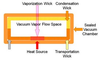 Нагревательный элемент контактирует с испаряющей поверхностью (шаг 1). Рабочая жидкость (очищенная вода) легко испаряется (шаг 2) благодаря низкому давлению. Пар движется (шаг 3) до конденсирующей поверхности, где возвращается назад в жидкое стояние (шаг 4), благодаря тому, что эта поверхность дополнительно охлаждается и ее температура значительно ниже. Жидкость абсорбируется (шаг 5) и по капиллярам возвращается к испарительной поверхности, после чего весь процесс повторяется заново.