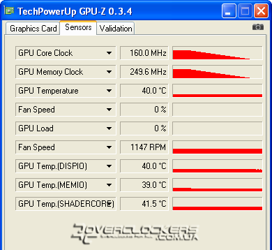 На этом экземпляре RivaTuner имела какие-то проблемы с отображением верных частот (хотя с разгоном и мониторингом температур проблем не было), поэтому мы приведем скриншоты утилиты GPU-Z, на которых видно, что при отсутствии нагрузки карта снижает частоты до 160 и 500 МГц, соответственно для ядра и памяти.