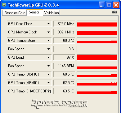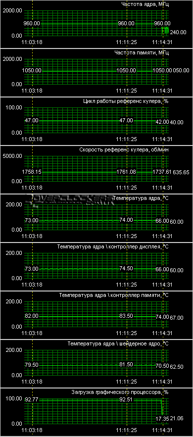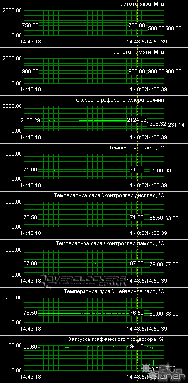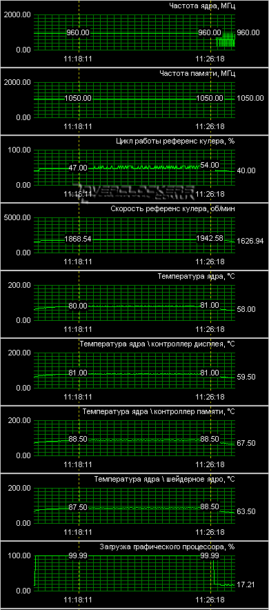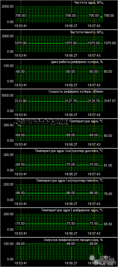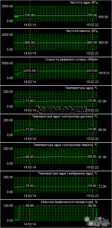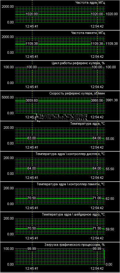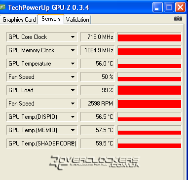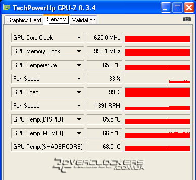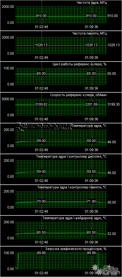 Система охлаждения в данном случае не играла роль сдерживающего фактора. Изначально мы подняли обороты вентилятора для тестов, но как потом оказалось, и на таких частотах карта смогла нормально функционировать в автоматическом режиме регулирования его оборотов. Ниже на скриншоте вы можете оценить температуру ядра при прогреве Fur Rendering Benchmark в разгоне при 2600 об/мин вентилятора.