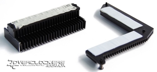 На элементы подсистемы питания установлен ребристый радиатор, который находится как раз под радиатором GPU и тоже обдувается нагнетаемым воздушным потоком.