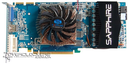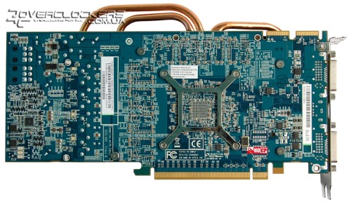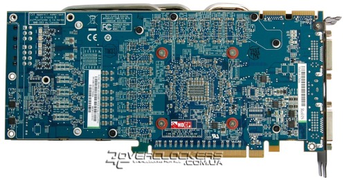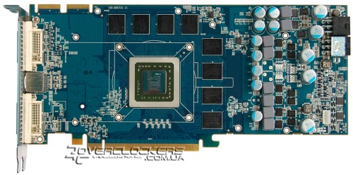 Адаптер отличается от референса не только двухслотовой системой охлаждения, но и дизайном. Он укорочен и GPU расположен ближе к краю платы, в то время как подсистема питания вынесена к интерфейсным разъемам, а не возле разъема дополнительного питания, как у референса. В принципе, такие карты для нас не в новинку, и на первый взгляд по дизайну PCB это копия HD 4850 Dual Slot Fansink.
