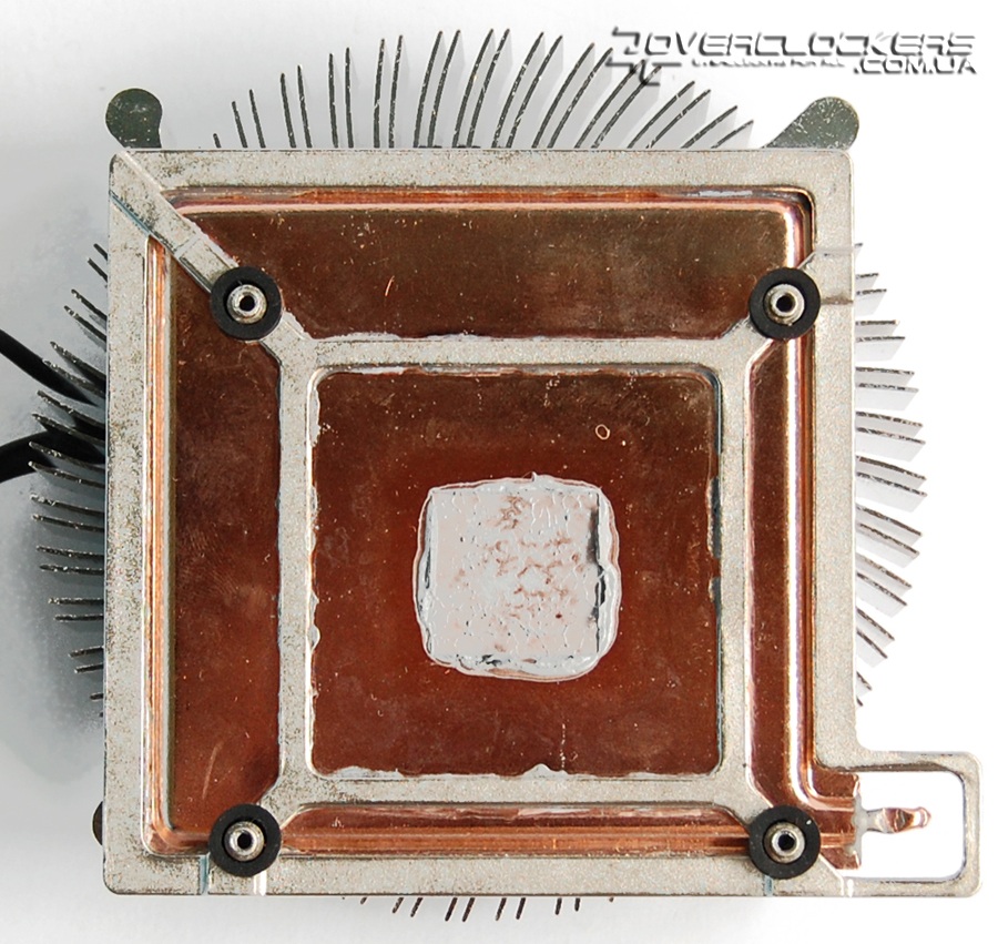 Основание имеет отросток, напоминающий запаянную тепловую трубку, да и само основание, если взглянуть сверху, может показаться, что представляет собой спираль из свернутой трубки. На самом деле, концентрические окружности — это припой, т.е. радиатор, кроме большой массивной сердцевины, контактирует с испарительной поверхностью камеры и всеми своими ребрами.