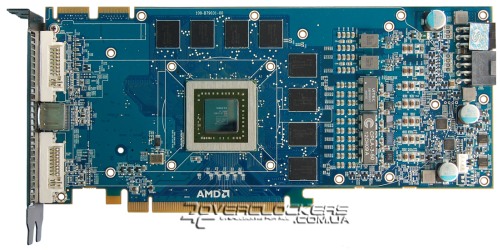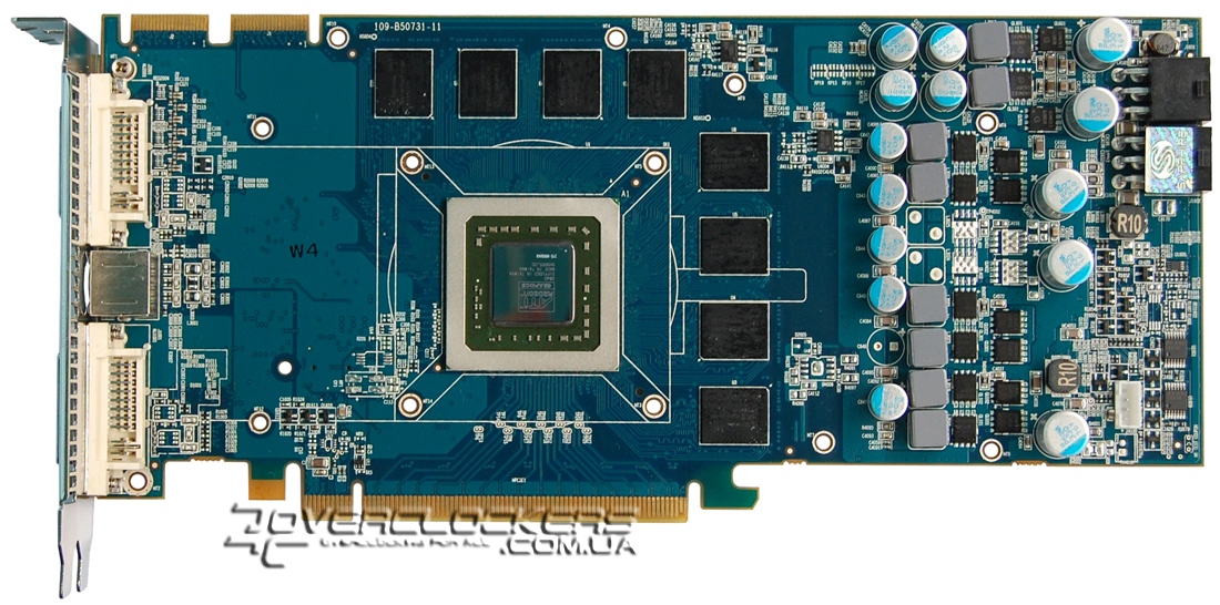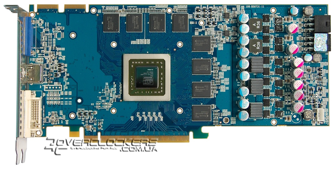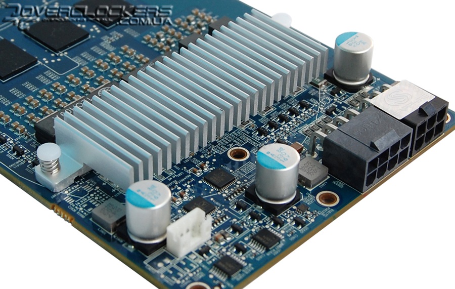 Сама же подсистема питания выполнена уже по цифровой схеме, а дизайн PCB не отличается от референса. Обращает на себя внимание наличие 8-контактного разъема дополнительного питания, в то время, как на стандартной Radeon HD 4890 обычно распаяно два 6-контактных, хотя на референсной плате тоже изначально предусмотрено посадочное место под 8-контактный разъем.