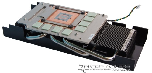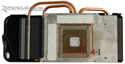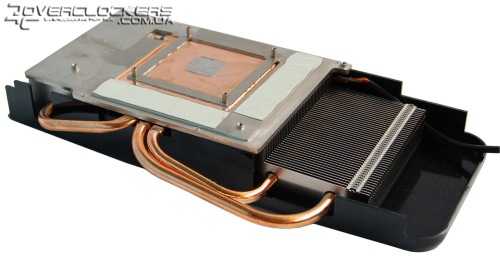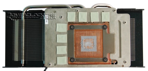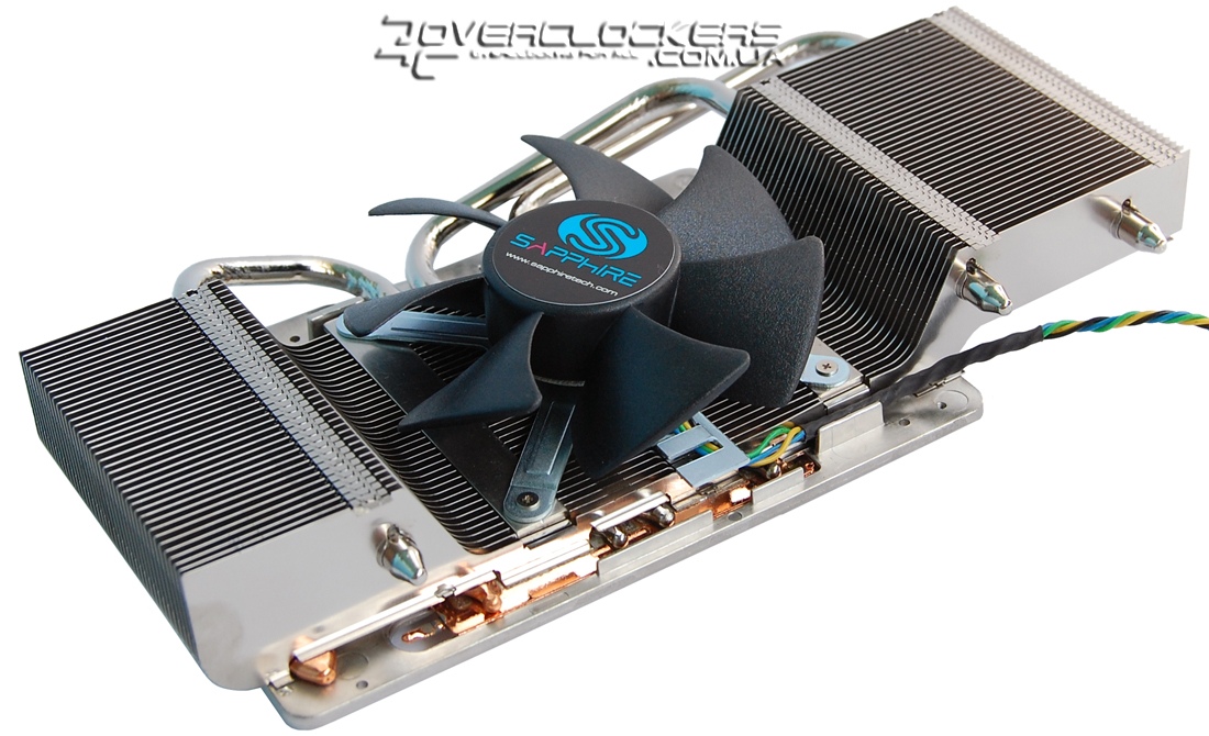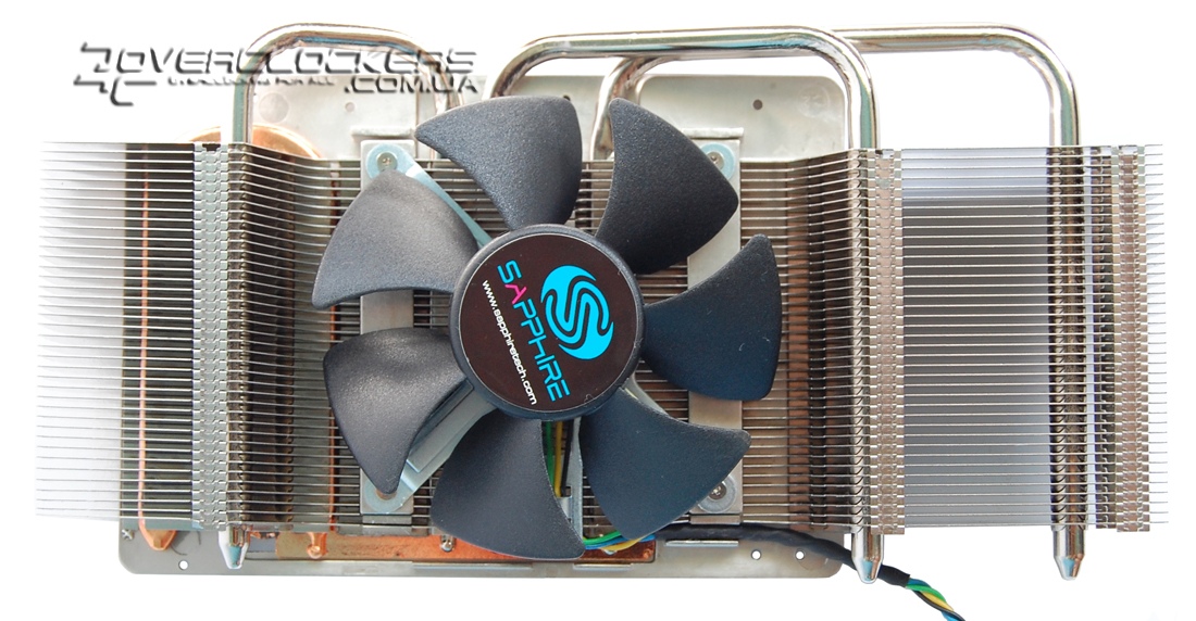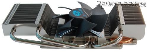 В качестве основания теплосьемника выступает испарительная камера, от которой отходят три изогнутые тепловые трубки, пронизывающие многочисленные ребра радиатора. Сам радиатор приобрел более традиционную прямоугольную форму довольно крупных размеров. Обдувается он большим вентилятором диаметром 90 мм (крыльчатка 85 мм) и высотой 25 мм. Из-за таких габаритов вентилятора центральная часть всей конструкции остается «пустой», ведь высота пластин радиатора в этом месте минимальна. Жаль, что производитель не решил сделать радиатор цельным и однородным, оснастив его двумя тонкими вентиляторами, как это было сделано у Radeon HD 4870 Sonic, что помогло бы и площадь радиатора увеличить, и эффективность двух низкооборотистых и тихих вентиляторов была бы точно не меньше, чем одного большого и высокоскоростного. Зато в данной конструкции часть горячего воздуха выдувается сразу за пределы корпуса.