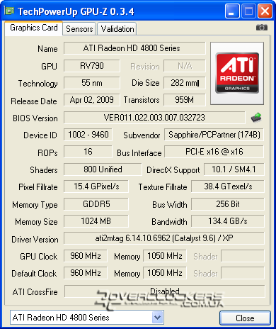 Соперниками рассматриваемых карт будут GeForce 9800GTX+ и GeForce GTX 260. Первая карта является адаптером Point of View GF9800GTX 512MB GDDR3 EXO с установленными стандартными частотами для GeForce 9800GTX+/GTS250. Вторая карта — это разогнанная версия XFX GeForce GTX 260 Black Edition, которая была дополнительно протестирована и на эталонных частотах, выступив в роли референсного GeForce GTX 260. Также для наглядности в графики добавлены результаты обычной версии Radeon HD 4890, которая была получена путем снижения частот Sapphire Vapor-X TOXIC HD 4890 до 850/3900 МГц.