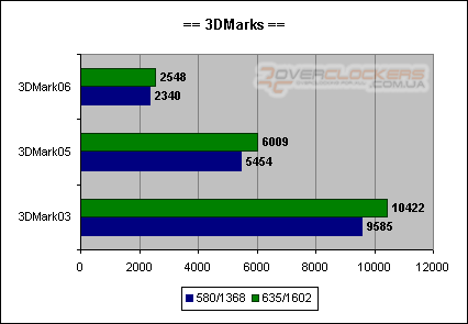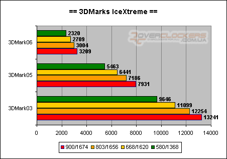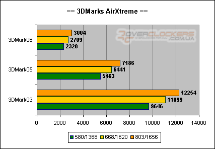 После многочасовых испытаний с повышением напряжения на ядре до 1,87 В и на памяти до 2,07 В были покорены 803 МГц по чипу и 1656 МГц по памяти. А 3DMark'и порадовали хорошими результатами: